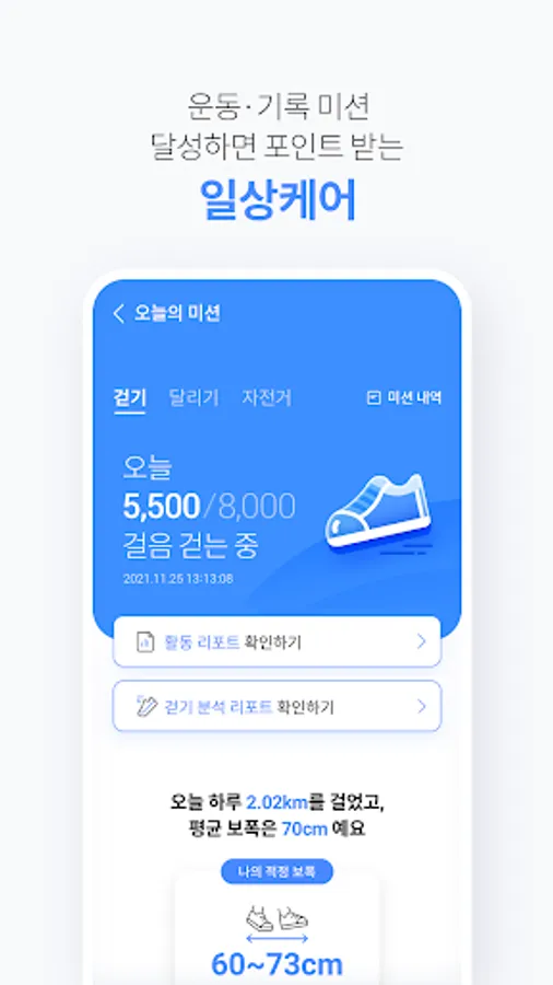 - 이 앱은 고객님의 사전 동의를 통해 삼성 헬스 앱과 연동하여 운동, 걸음 수, 체중, 혈당, 혈압 데이터를 수집합니다. 수집된 정보를 활용하여 일상 케어, 질병 케어 등의 서비스를 제공합니다.