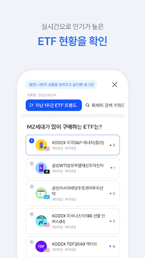4. Check the real-time status of popular ETFs in 'ETF NOW', and figure out your investment propensity through the 'Investment MBTI' test.