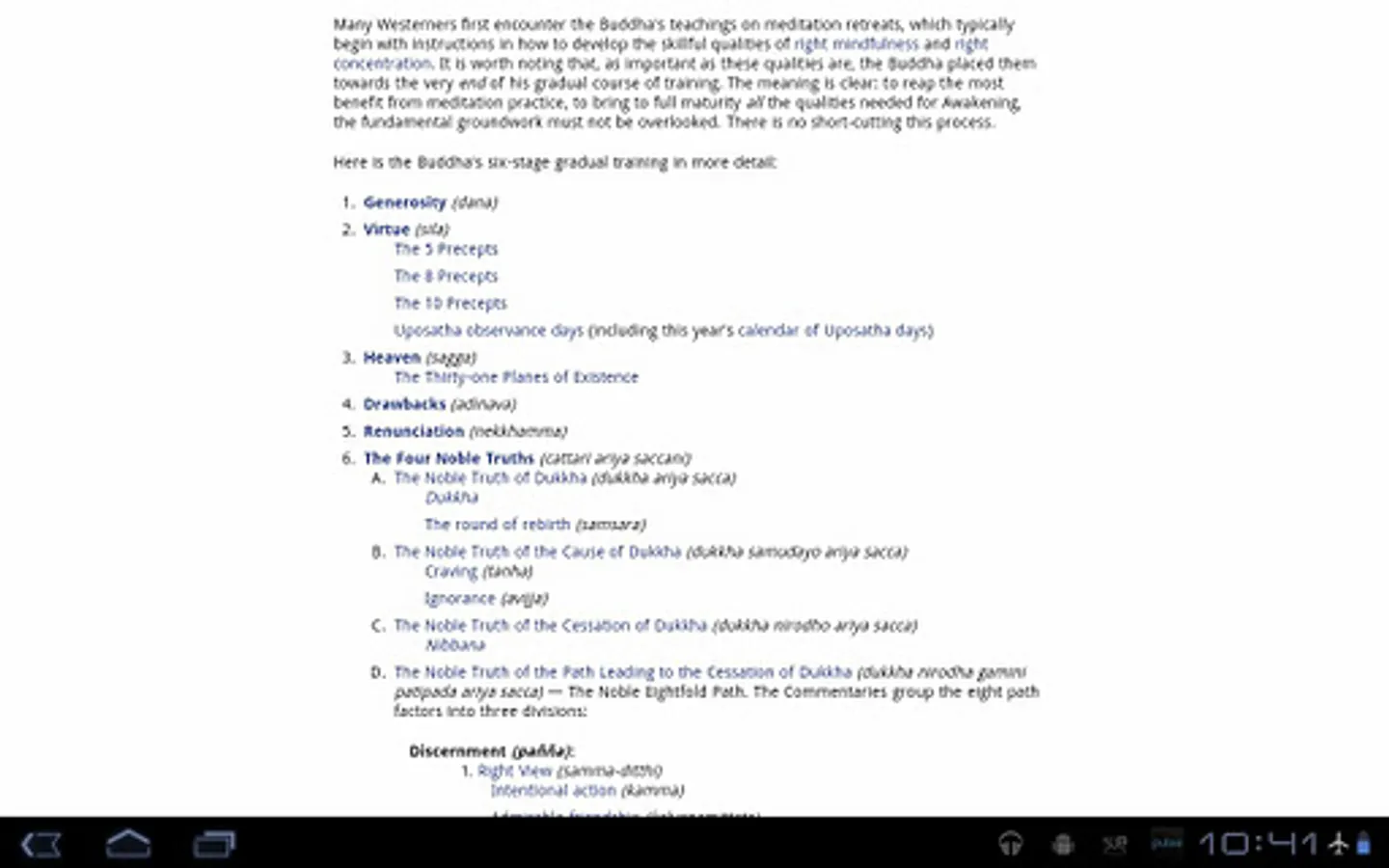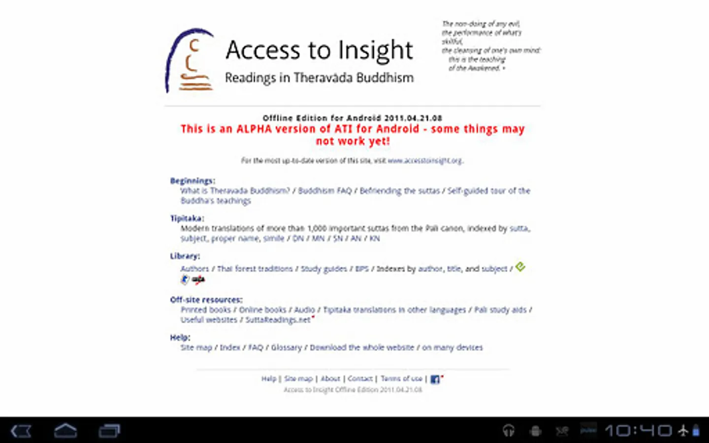 The offline version of Access To Insight (http://www.accesstoinsight.org) for Android devices. Access To Insight is a popular website that presents a large collection of readings in Theravada Buddhism. This app allows you to take (almost) the whole website with you to read when you are not connected to the Internet.
