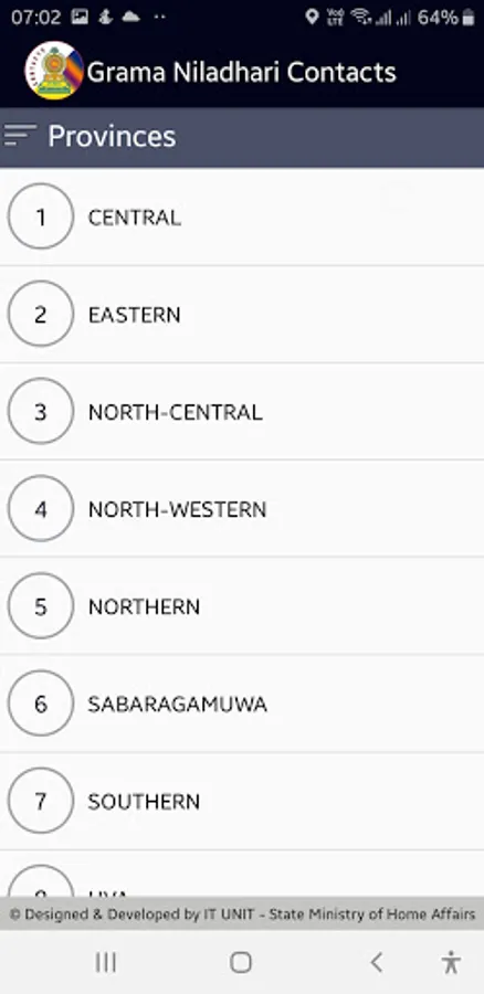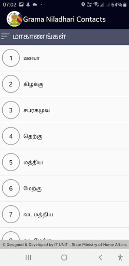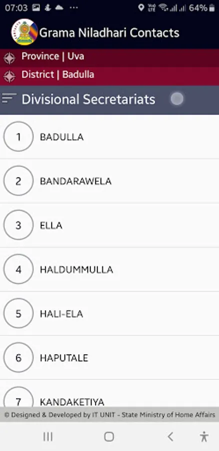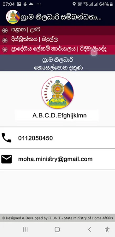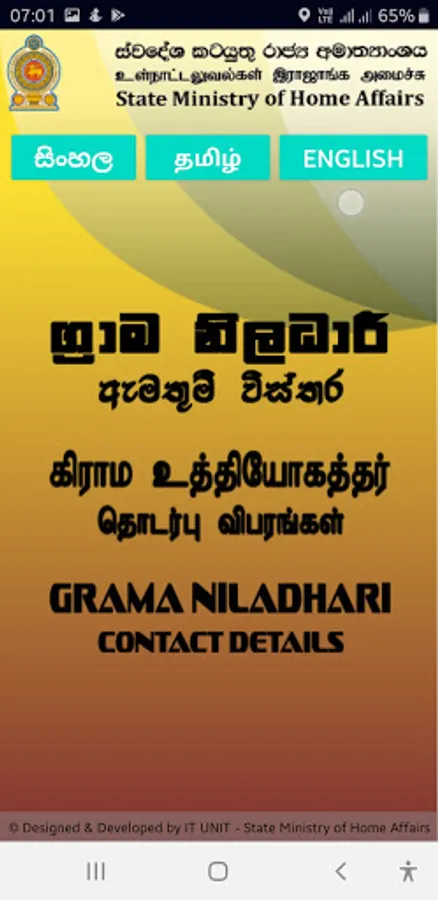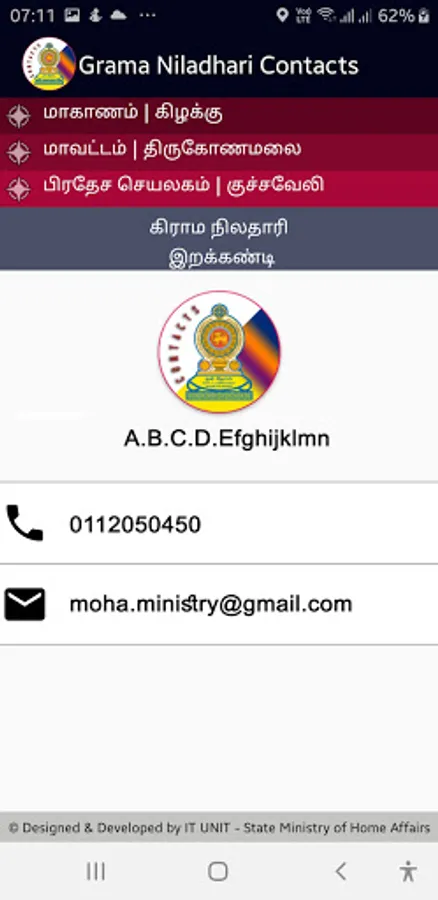 This app itself supports general public to find the contact details of the Grama Niladharies throughout the Island. The contact details are updated by the respective Divisional Secretariats monthly. The app was designed and developed by the Information Technology unit on the state ministry of Home Affairs