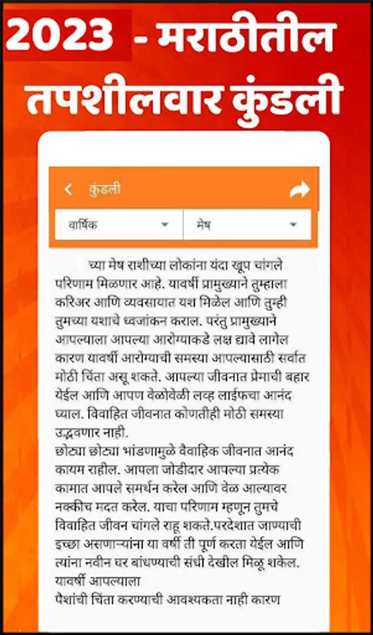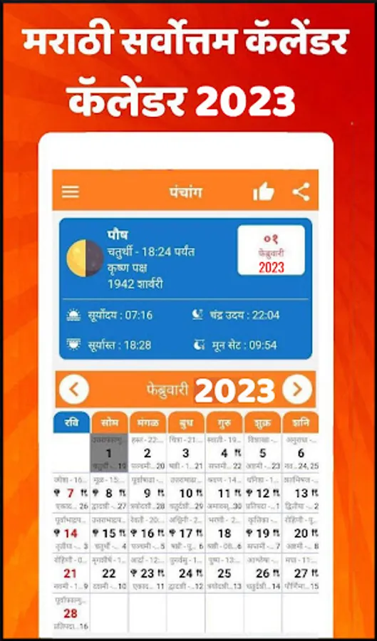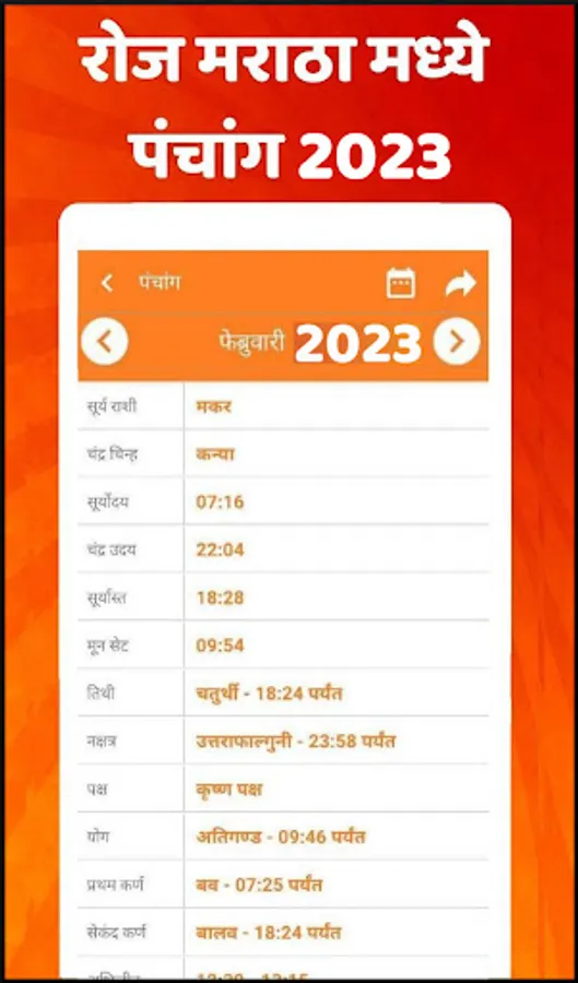 Marathi calendar panchang 2023 is the latest marathi panchang 2023 and marathi calendar 2023. App gives all the important calendar and panchanga details such as rashifal 2023 in Marathi for free राशी भविष्य मराठी 2023.