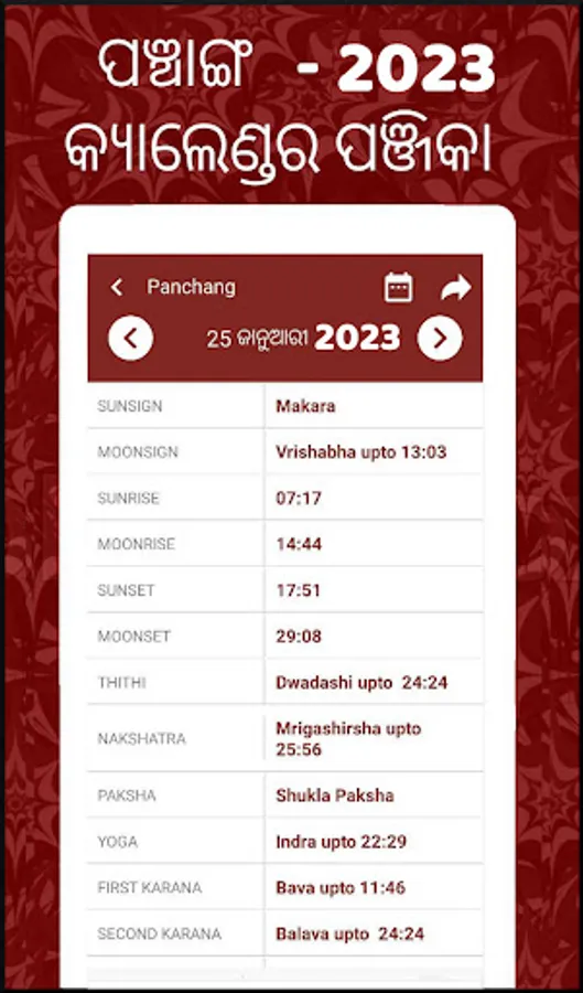 Odia Panjika 2023: App gives all important panchang details like Lunar Month, First Karana, Second Karana, Sunsign, Moon Sign, Abhijit Kala, Our Muhurtam, Amrita Kalam, Rahu Kalam, Gulika Kalam, Yamaganada kala and Varjyam