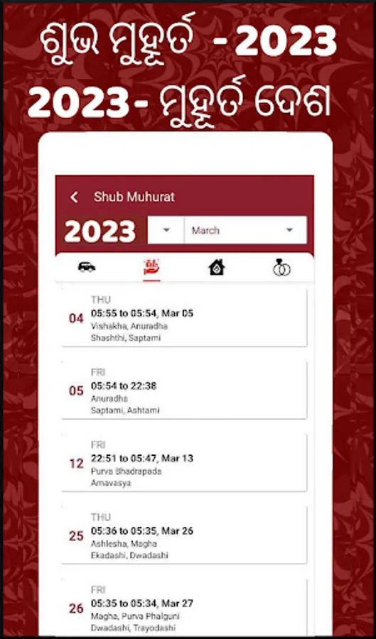 Odia Muhurat 2023: all important muhurats like marriage Muhurat / viva muhurat, vehicle purchase, property purchase, griha pravesh dates for the year 2023 and 2023 available in this app - Best Muhurat 2023 app (ଓଡ଼ିଆ କ୍ୟାଲେଣ୍ଡର)