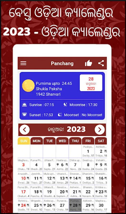 ● Single app with 2023 and 2023 year calendar and panchang for orissa speaking people Odia panchang 2023