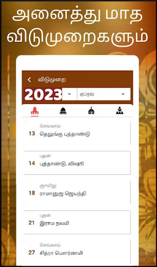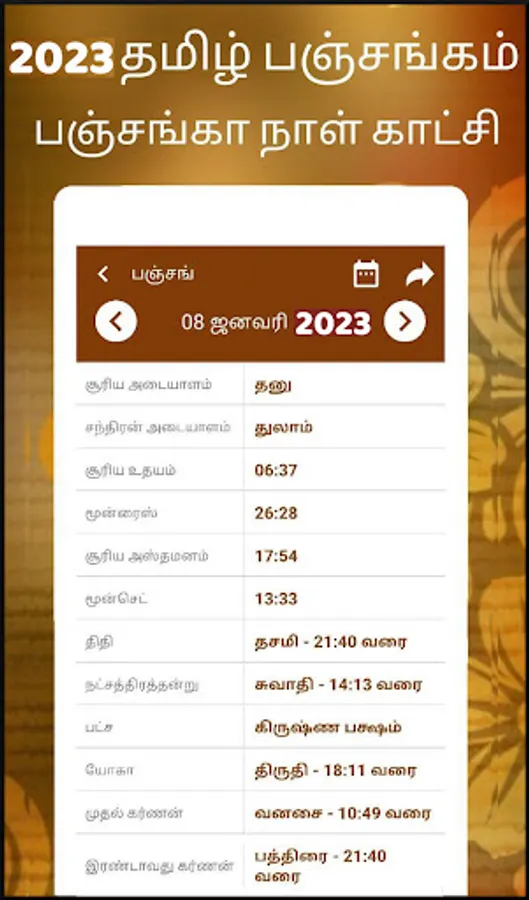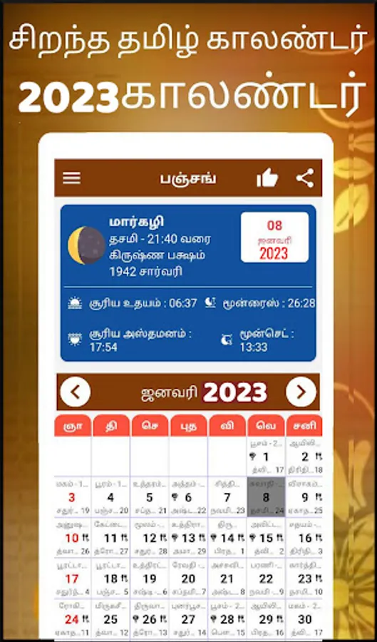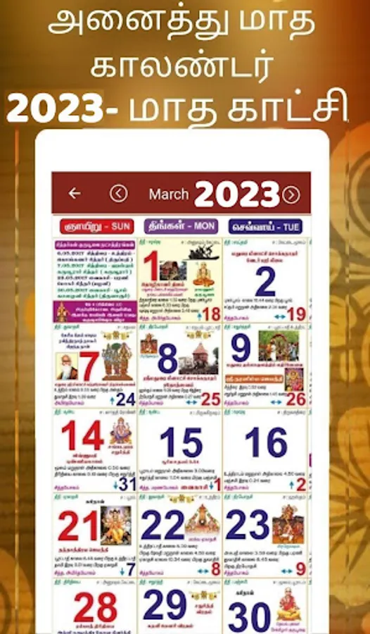 This calendar for 2023 is the 2023 calendar new with all month calendar. Tamil calendar 2023 is highly useful for Hindu people, also called as Hindu calendar. Hindu calendar 2023 in tamil gives all the important calendar of tamil panchangam with precise fasting details. This app is very useful for 2023 festivals and tamil holiday details.
