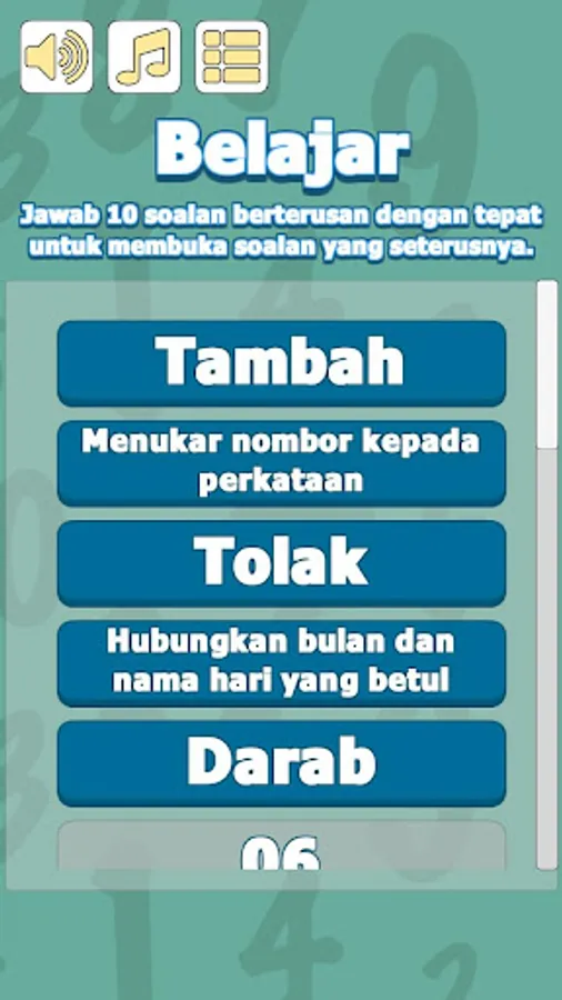1. Belajar - menguasai pelbagai topik matematik seperti pernambahan, masa, waktu, wang dan sebagainya.