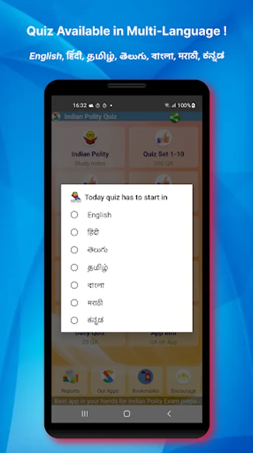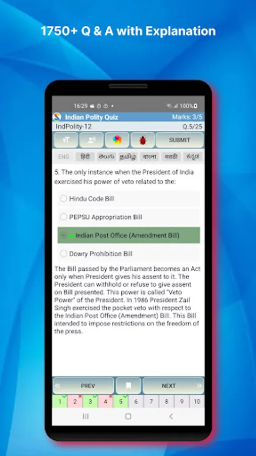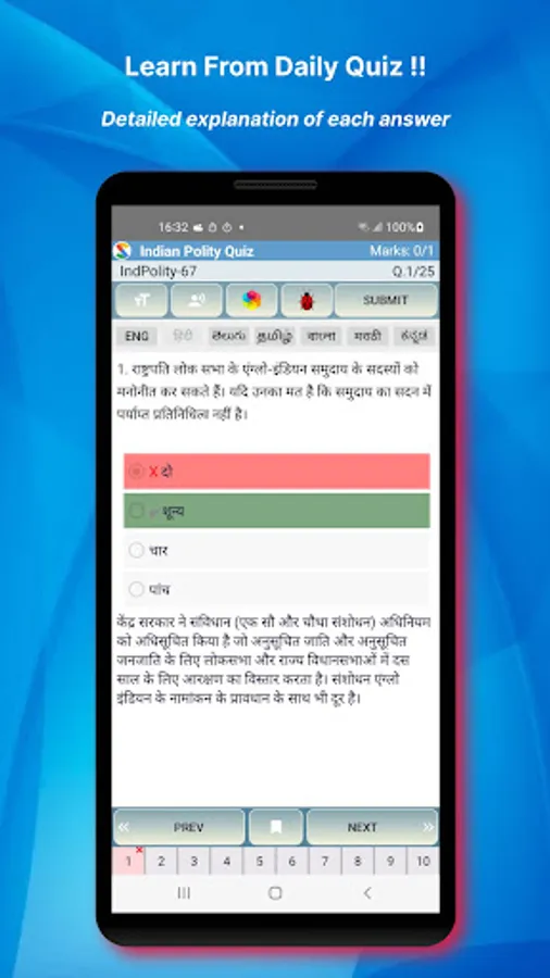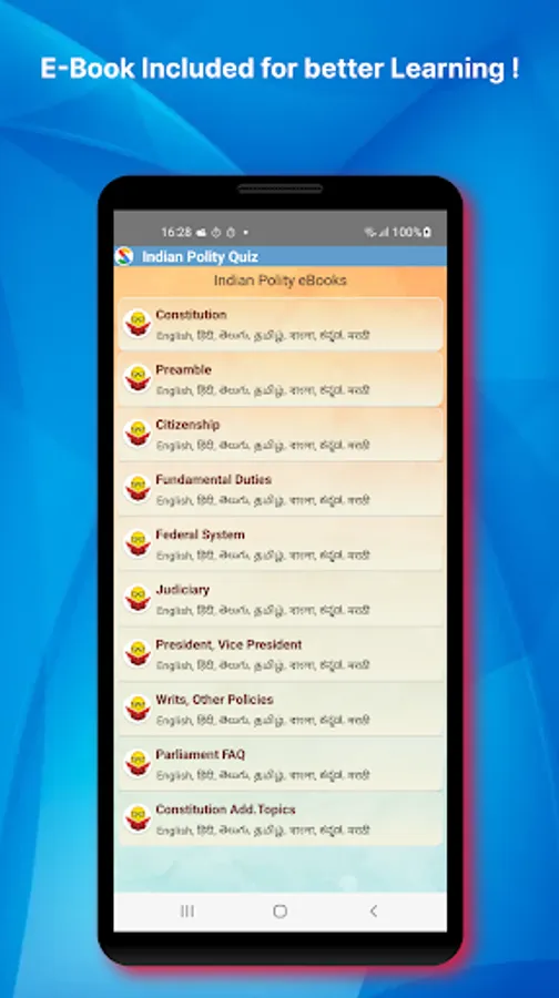 Indian Polity Quiz, Study notes,5000+ Objective MCQ's with answers and solutions. All contents are unlocked and provided free for students to benefit in a fast user-interface. Contents are provided in English, Hindi, Telugu, Tamil, Kannada, Bangla and Marathi.