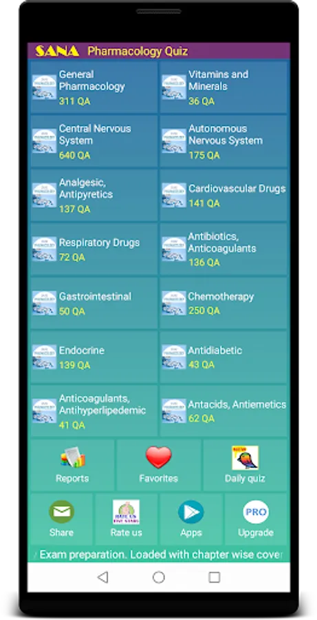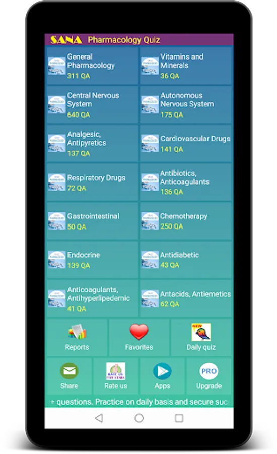Pharmacology Quiz apps is an innovative concept from Sana Edutech that provides learning materials on Android app in a fast and nice user-interface.
