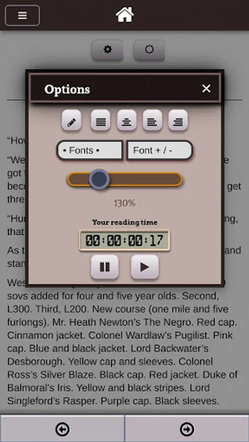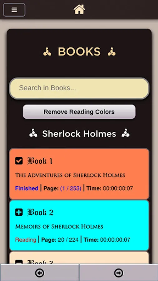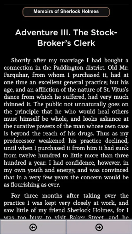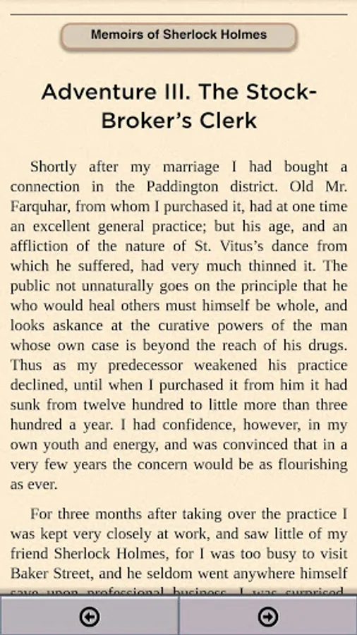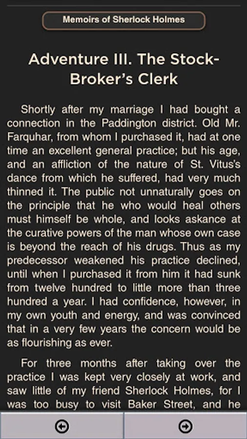You will be able to read all Arthur Conan Doyle books in one app. The application is designed to meet all the needs of the reader. The application automatically saves everything. Each book is saved separately. The application automatically saves the last read page, all style changes, background color selections, line spacing selections, and other changes.