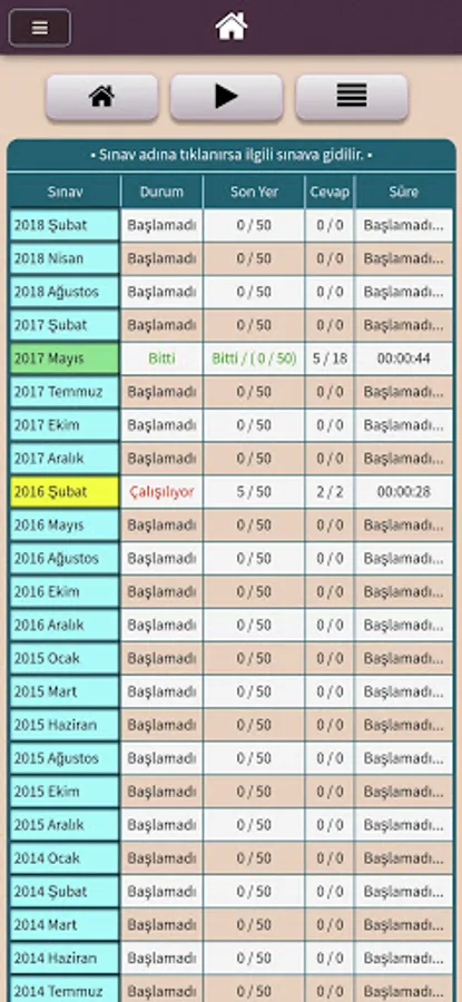 With the latest arrangements, new functions have been added to the application. You will now be able to see the work in progress on the home screen when you first open the app. In addition, a statistics page has been added where you can see the studies and get information for all exam studies. From this page, you will be able to follow all your lessons collectively. You can easily go to the half-finished or re-solved exam by clicking on the exam name. Statistics page lists your work that has never been started, in progress, and finished with your activities, such as response status work time.