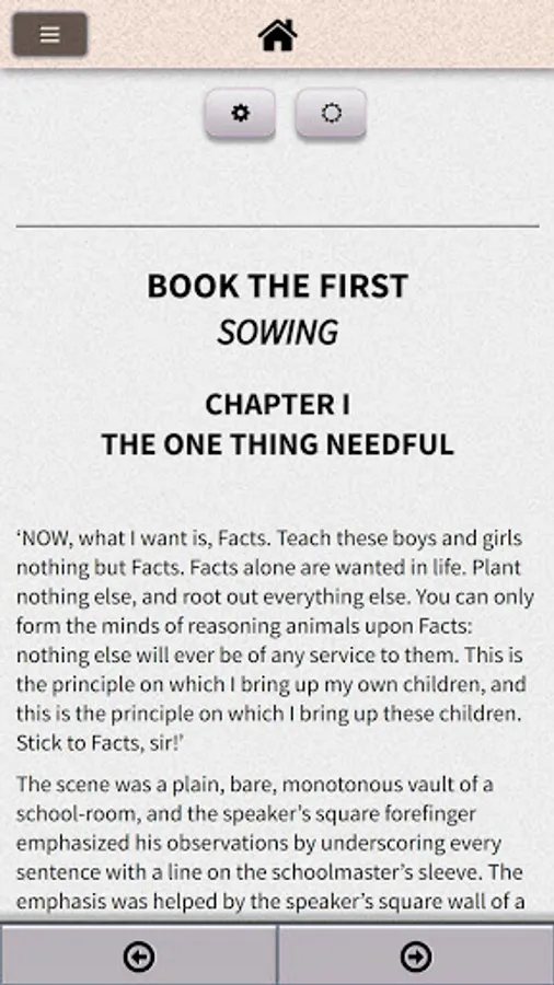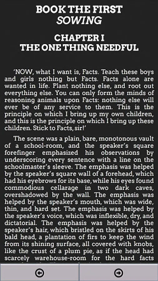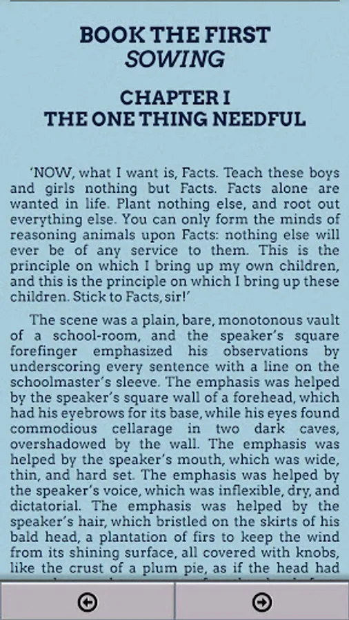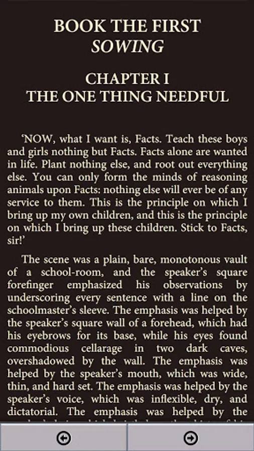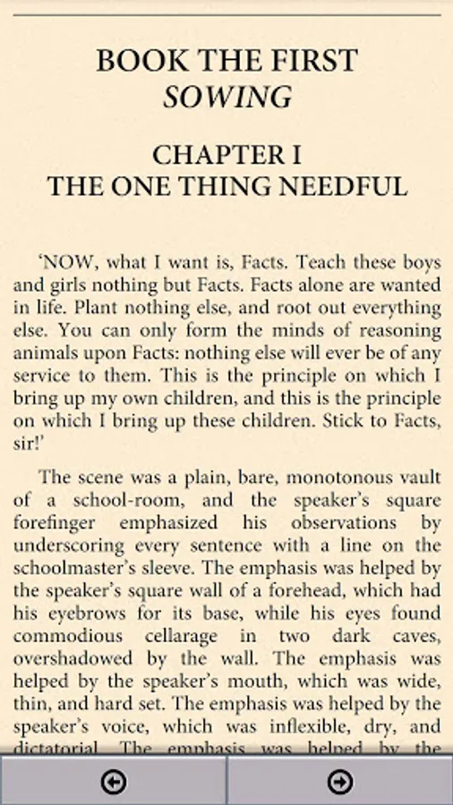 Superintendent Mr. Gradgrind opens the novel at his school in Coketown stating, "Now, what I want is Facts. Teach these boys and girls nothing but Facts", and interrogates one of his pupils, Cecilia (nicknamed Sissy), whose father works at a circus. Because her father works with horses, Gradgrind demands the definition of a horse. When she is scolded for her inability to factually define a horse, her classmate Bitzer gives a zoological profile, and Sissy is censured for suggesting that she would carpet a floor with pictures of flowers or horses.