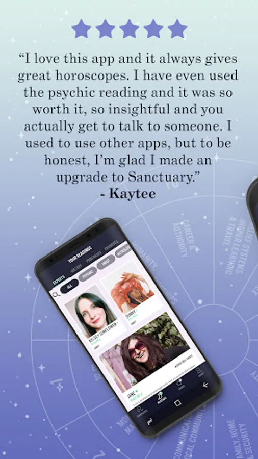 Discover Sanctuary: the first-ever astrology app to provide an interactive birth chart and live, on-demand personalized psychic reading, and daily horoscope with real professional astrologers, psychics, and tarot card readers.Only Sanctuary allows you to choose your own expert astrologers, psychics and tarot readers, forming personal connections between you and the reader.