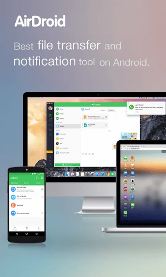 AirDroid is your best personal mobile device management suite, which is built on 10 years of non-stop improvements, including file transfer and management, screen mirroring, remote control, and receive SMS notifications right from your computer - all can be done with just one AirDroid app.