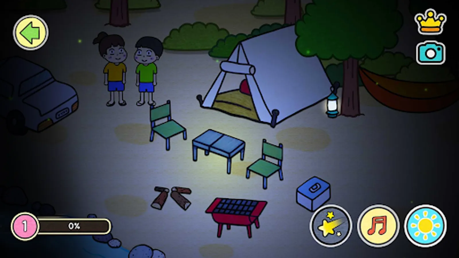Vrrrm! You've arrived at the campsite in your car! Take out, set up, and decorate various camping equipment like tents, chairs and hammocks.