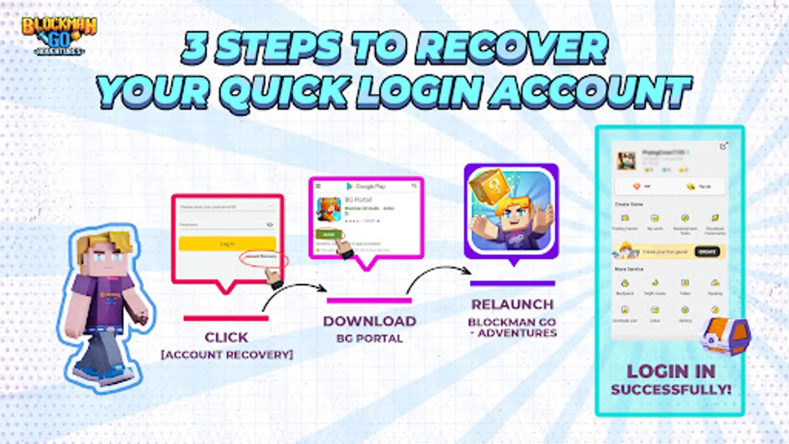 Players need to have BG Portal and Blockman GO - Adventures installed on the device that they previously played their old accounts with. Once Blockman GO - Adventures is launched, BG Portal is designed to recover previous account information and automatically sign in to it.