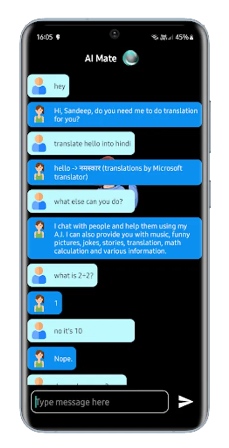 Introducing AI Mate, the friendly Android app powered by an AI bot. Engage in delightful conversations with a warm and positive companion. Enjoy a safe and judgment-free space, where the bot offers empathetic responses and encourages positivity. Experience a lighthearted and uplifting chat experience that's always ready to brighten your day. Download AI Mate now for a friendly virtual friend at your fingertips.