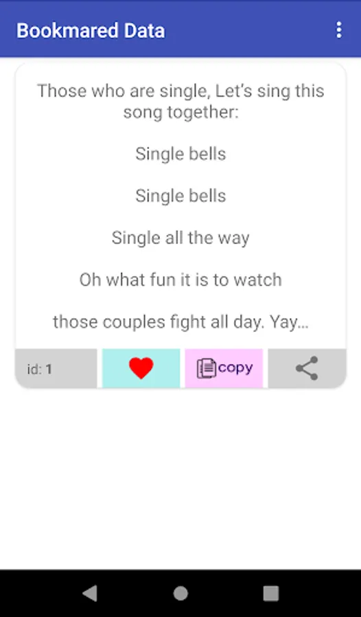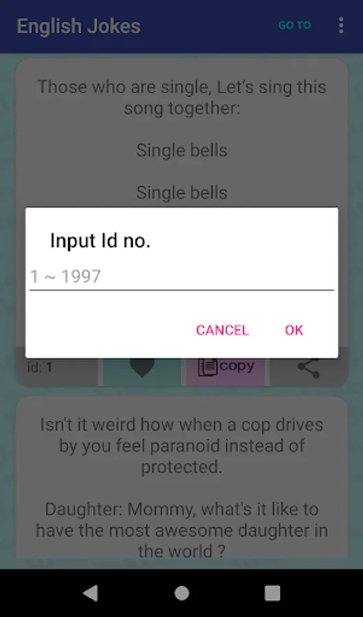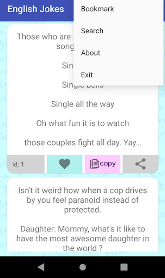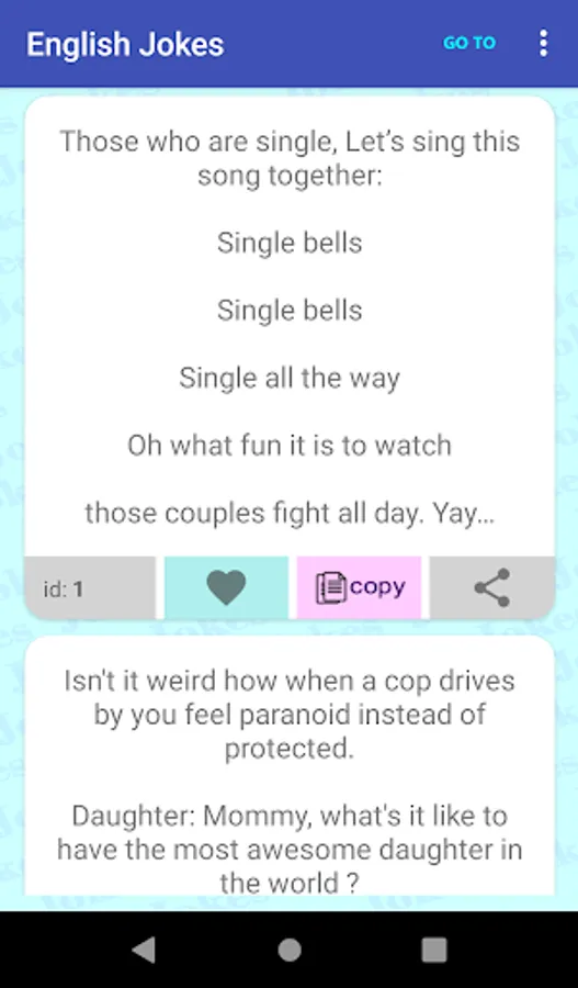features of the app:-Joke collection in English,For quick browsing set bookmark your favorite jokes,Share your jokes with friend using share option,High performance and less memory consumption app, You can copy the text by click on copy button and paste wherever you want to share, you can also see random jokes and share it, High performance and less memory consumption app