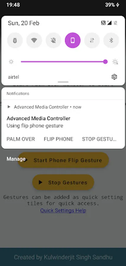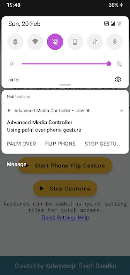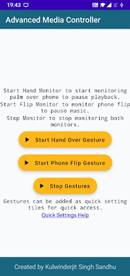 Advanced Media Controller provides advanced gestures to quickly pause and play media playing on phone. Quick media pause with gestures is very useful when you want to pause media momentarily while talking to someone when you are working on your desk. Palm over phone gesture pauses music while your hand is over the phone and starts playing when hand is off the phone. Flip phone gesture pauses media when phone is flipped down (screen facing down) and media starts playing when phone is in normal position. Application supports system dark mode. It is completely free and ad free and will be so always.