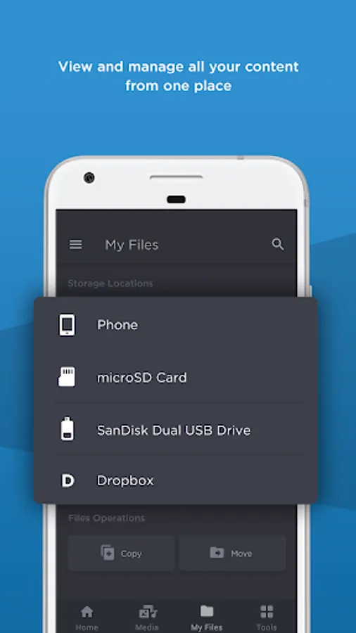Add and manage external storage locations such as a compatible SanDisk Dual Drive, SanDisk Solid State Drive, or microSD card*. The app also supports popular cloud services**.