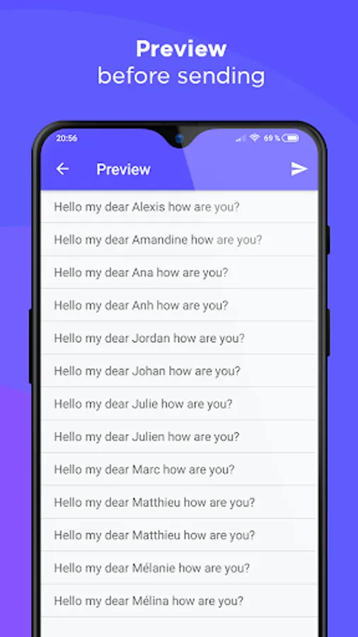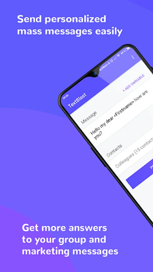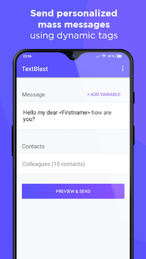 TextBlast will dynamically add the firstname, and/or lastname of your contacts depending on your needs. The SMS app will be opened for each contact with the customized text and the contact filled. You will just have to send them!