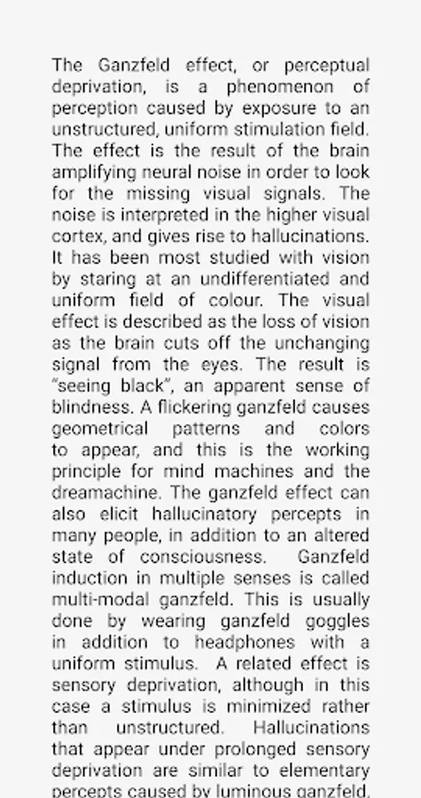 The Ganzfeld effect, or perceptual deprivation, is a phenomenon of perception caused by exposure to an unstructured, uniform stimulation field. The effect is the result of the brain amplifying neural noise in order to look for the missing visual signals. The noise is interpreted in the higher visual cortex, and gives rise to hallucinations. It has been most studied with vision by staring at an undifferentiated and uniform field of colour. The visual effect is described as the loss of vision as the brain cuts off the unchanging signal from the eyes. The result is “seeing black”, an apparent sense of blindness.