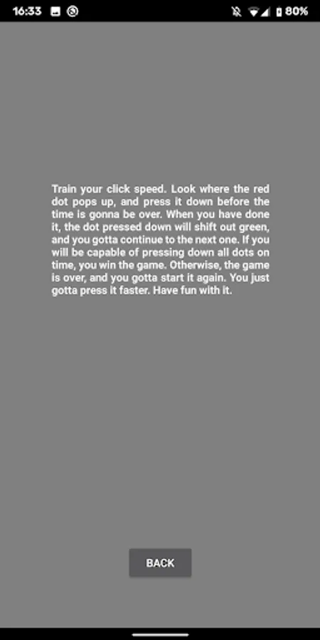 Train your click speed. Look where the red dot pops up, and press it down before the time is gonna be over. When you have done it, the dot pressed down will shift out green, and you gotta continue to the next one. If you will be capable of pressing down all dots on time, you win the game. Otherwise, the game is over, and you gotta start it again. You just gotta press it faster. Have fun with it.