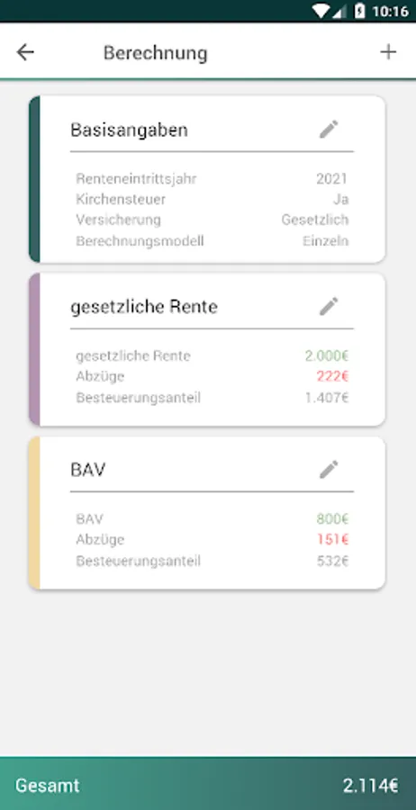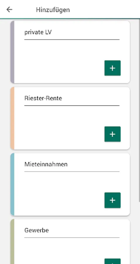 (Statutory pension, Riester, Rürup, company pension scheme, private life insurance, rental income, commercial income)