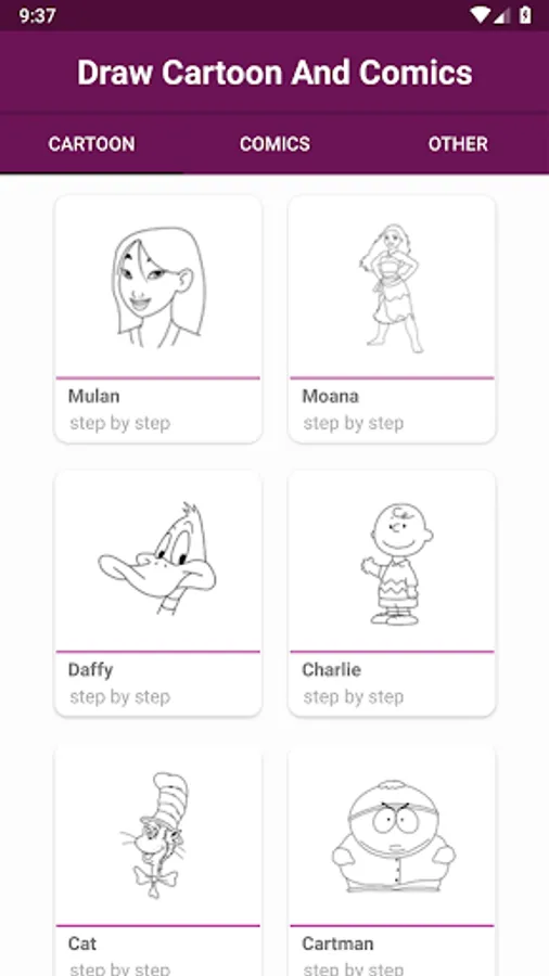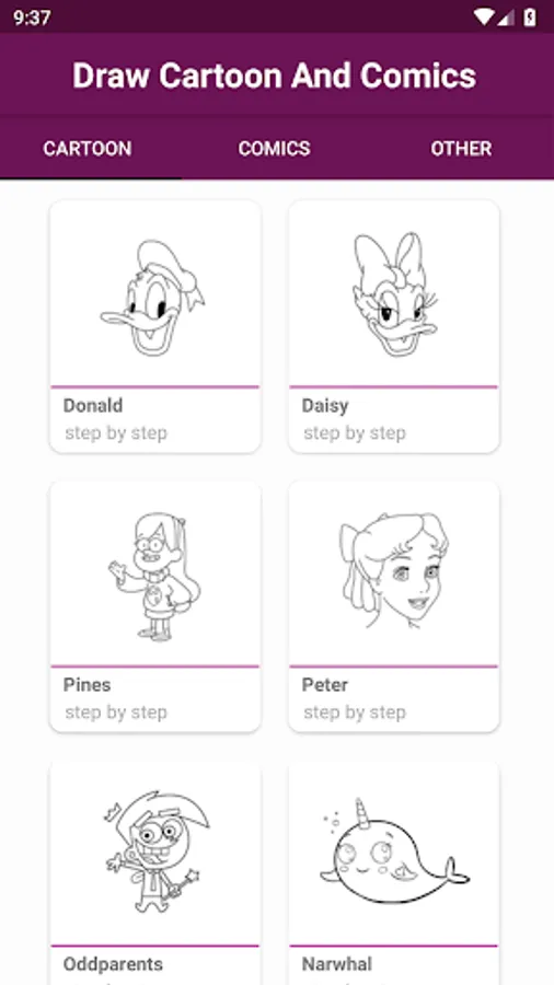 Did you like cartoons in your childhood? Find many cartoons that you can illustrate. Become an artist and learn how to draw your favorite Cartoon or comics. Our goal is to improve your artist's creativity and imagination. Cartoon drawing app for all beginners!