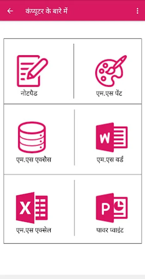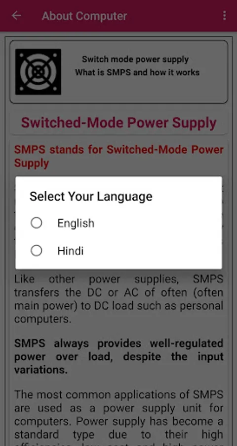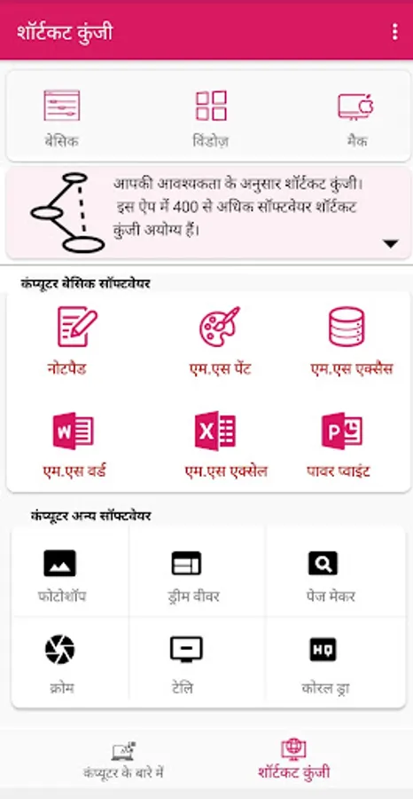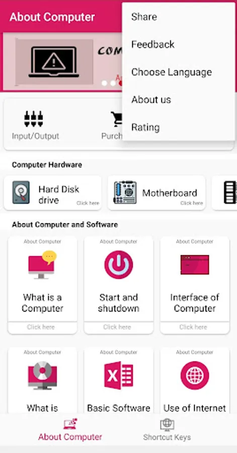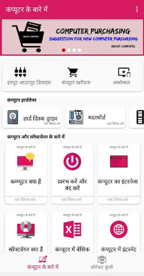Using this app you will be able to learn how to use computers start with your basic.this application include more about the basic knowledge of computer.you can use this app in both Hindi and English language.this app also includes the Main parts of computer like hardware, software, shortcut keys etc.