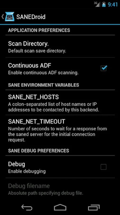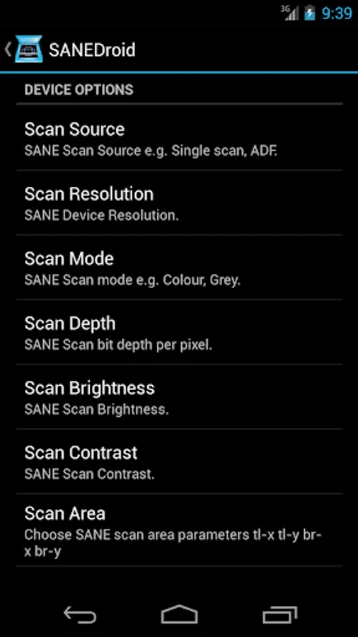 SANEDroid is an Android frontend for SANE (Scanner Access Now Easy). SANEDroid enables remote scanning from conventional "saned" and network-enabled desktop scanners to your mobile device without the requirement for a physical cable connection. The application provides you with the ability to manipulate rudimentary image acquisition properties such as scan source, mode, resolution and bit depth. Post acquisition images can be stored on your device and / or shared with others. Furthermore, SANEDroid provides you with the ability to capture SANE log files for debug purposes.