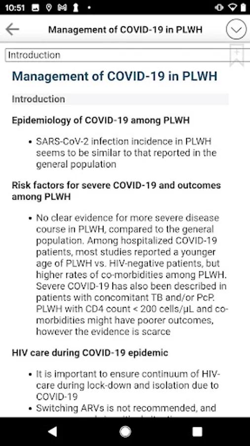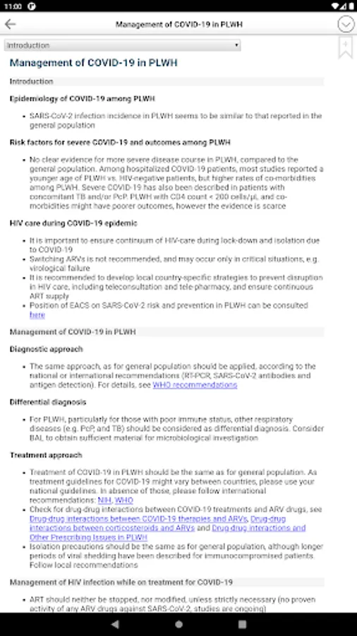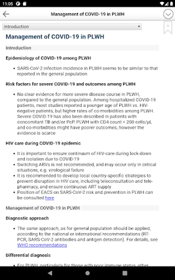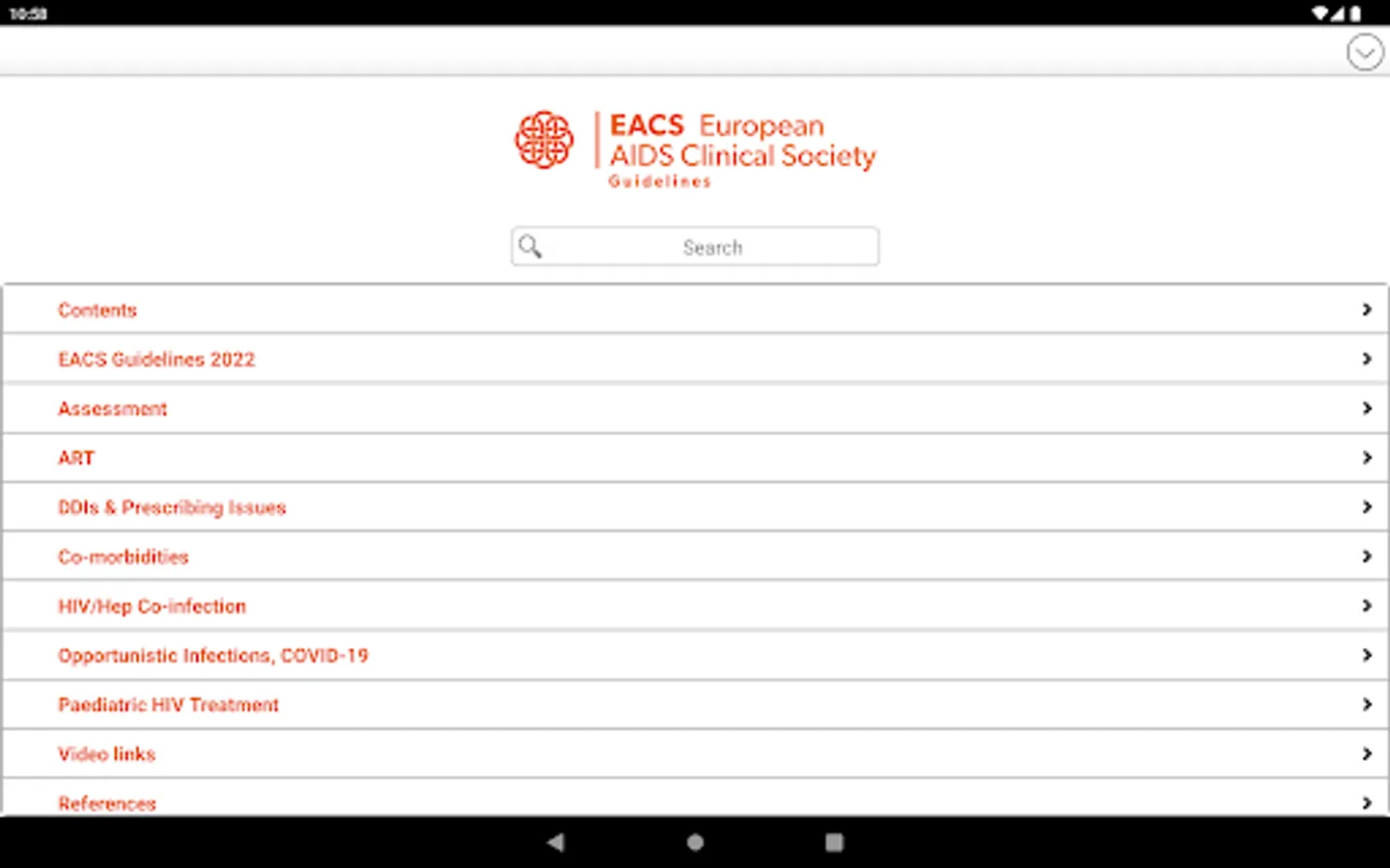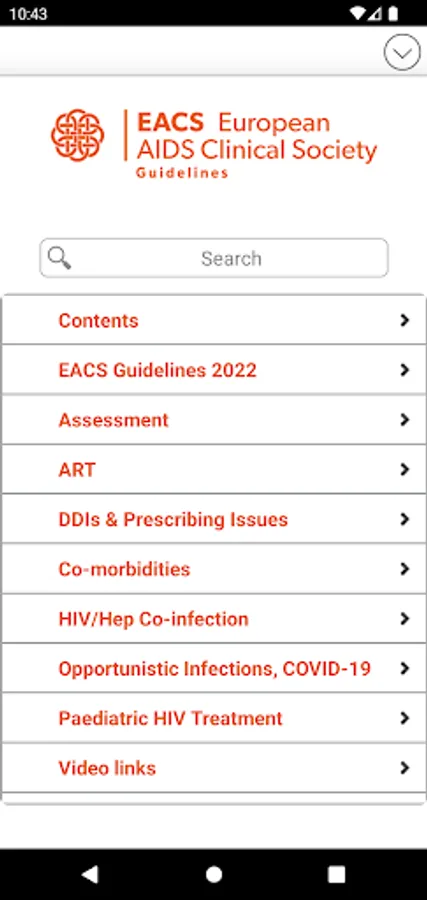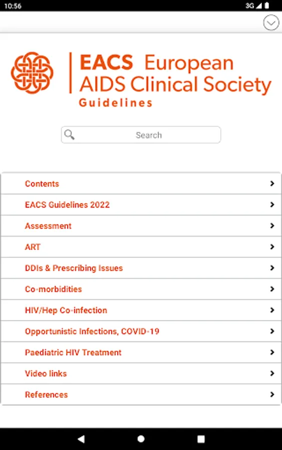 The EACS Guidelines provide guidance for healthcare professionals on: assessment of HIV-positive persons, antiretroviral therapy (ART), prevention and management of co-morbidities, co-infections and opportunistic infections. EACS App features include full text search, user-created bookmarks and notes, various tables and more.