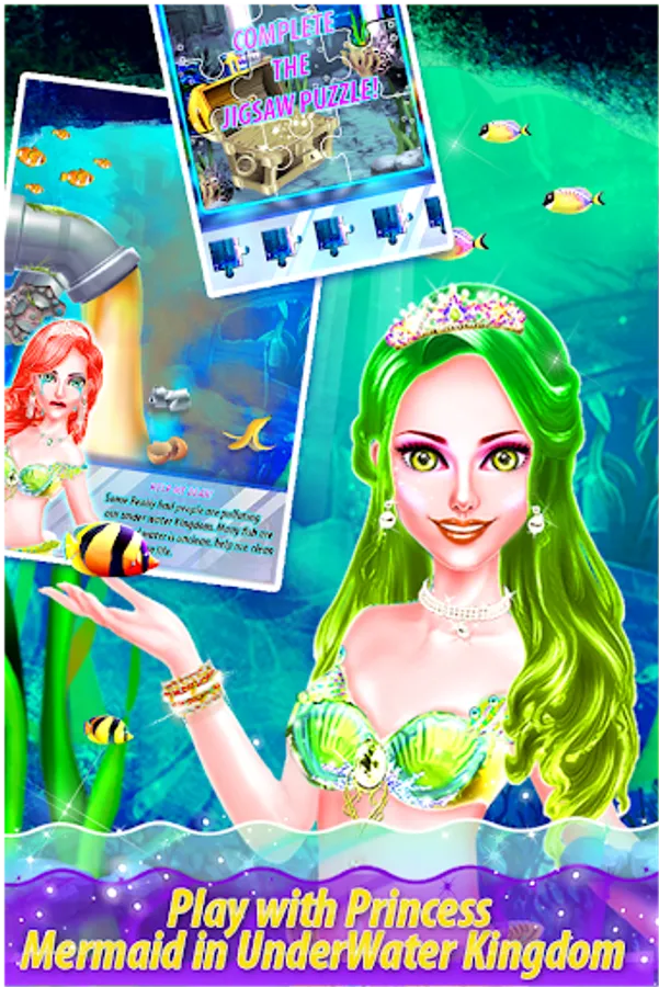 Restore the purity and beauty of deep sea so that the trapped fish can live in healthy clean water.Help beautiful sea princess by doing real mermaid makeup in an enchanting underwater makeup spa salon.Do some sparkle magic spa & dress up her in fashionable sparkly vibrant dresses so that she can impress her prince charming. choose from wide range of expensive fashion closet and style mermaid to dressup & look pretty for handsome prince.