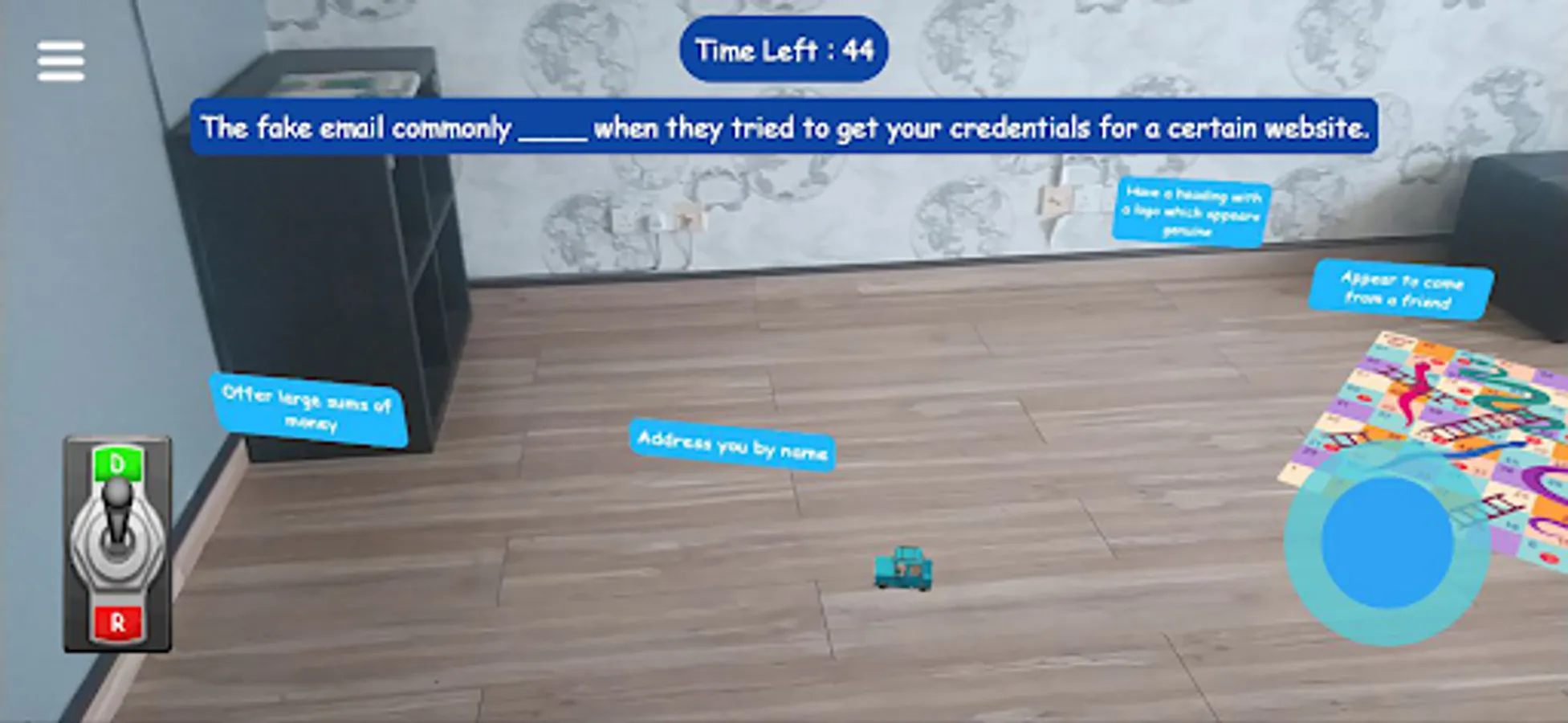 SWINDLERT is an augmented reality (AR) mobile gamification quiz-based game in three-dimensional (3D) environment concept for cybercrime edutainment. It educates the user for early cybercrime prevention in their life. The mobile gamification uses the concept of edutainment which consists of education and entertainment elements to ensure the users not only learn in the application but having fun with the games as it is a quiz-based game combined with the snake and ladder board game. It challenges the students to answer the question in a limited time given.