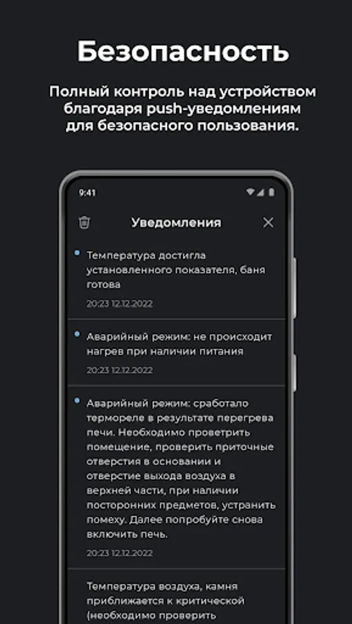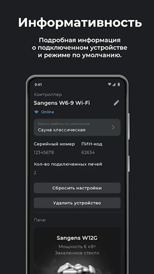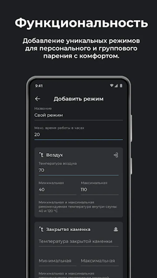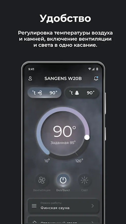Convenience - adjusting the temperature of the air and stones, turning on ventilation and light with one touch.