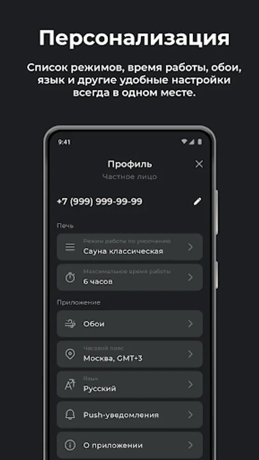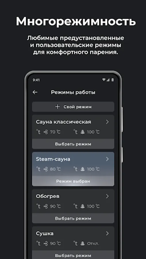 Personalization - a list of modes, operating time, wallpaper, language and other convenient settings are always in one place.