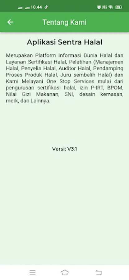 Platform Informasi dan Layanan Sertifikasi Halal, Pelatihan (Manajemen Halal, Penyelia Halal, Auditor Halal, Pendamping Proses Produk Halal, Juru sembelih Halal) dan Kami Melayani One Stop Services mulai dari pengurusan sertifikasi halal, izin P-IRT, BPOM, Nilai Gizi Makanan, SNI, desain kemasan, merk, dan Lainnya. Aplikasi ini bisa digunakan untuk memindai Barcode dari sebuah produk.