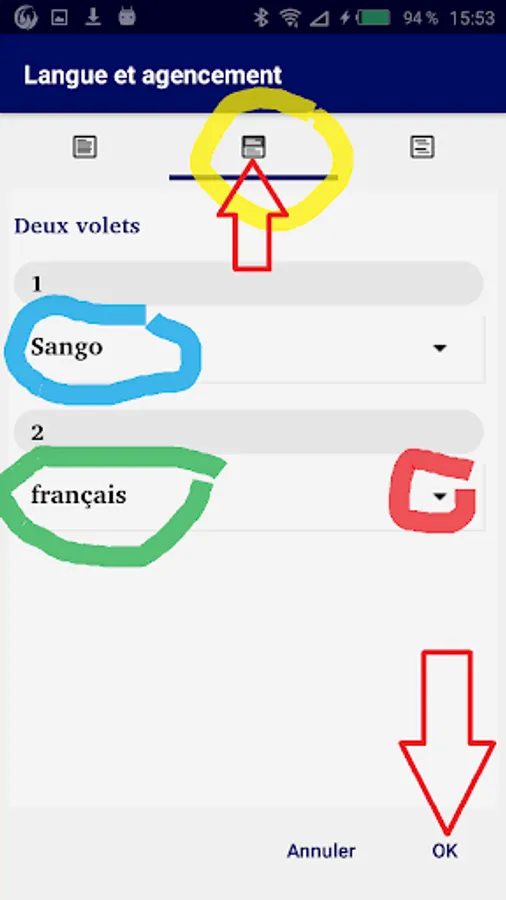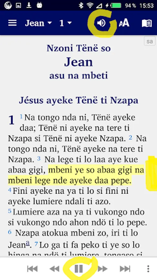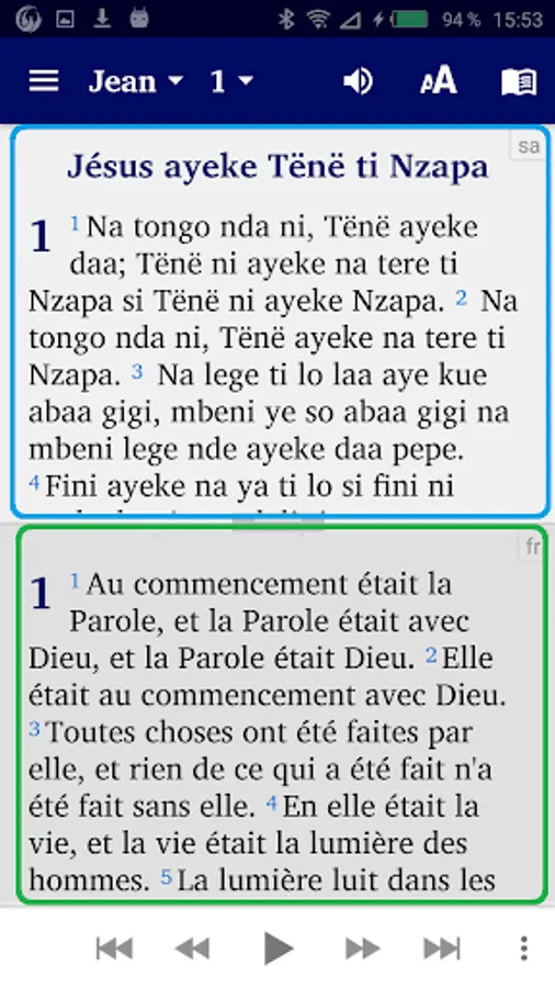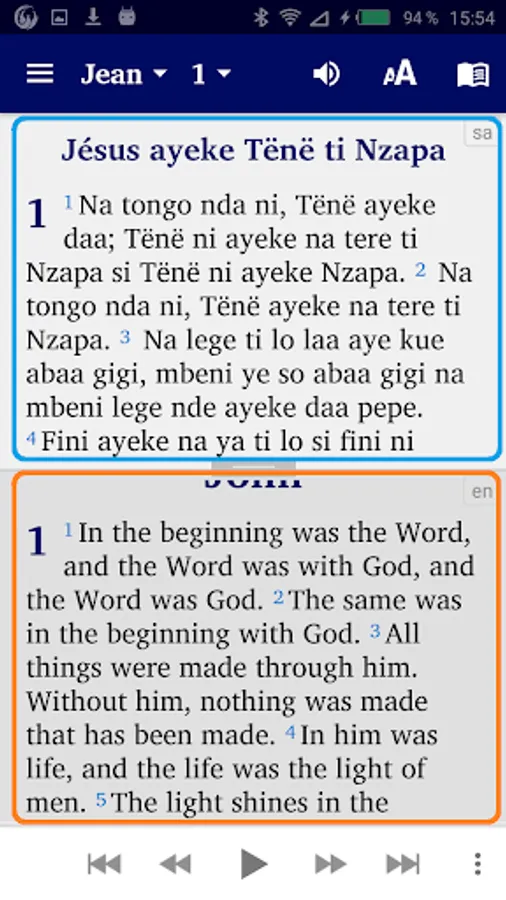 This application presents the word of God (Bible) translated into the Sango language spoken in Central Africa. If you press the small “book” icon at the top right, you can change the windows on the screen: Now choose either