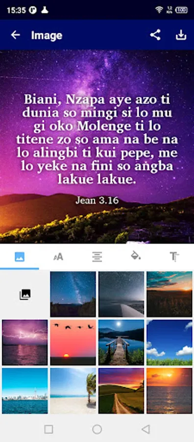 • When you tap on a verse, an image button is shown on the bottom toolbar. When this button is pressed, the 'Edit image' screen appears. You can choose the background image, move the text around the image, change the font, text size, alignment, format and color. the finished image can be saved to the device and shared with others.