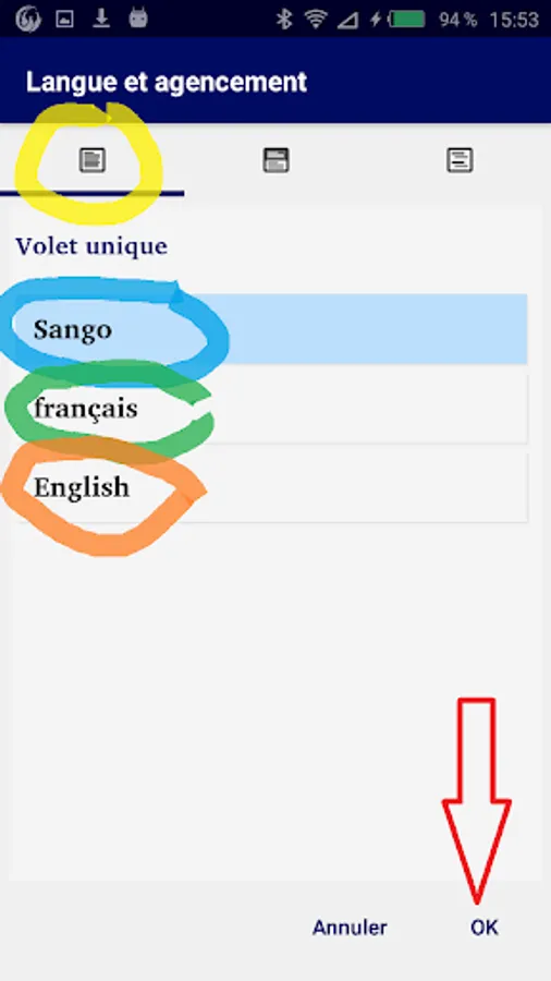- “two panels” to display the Sango at the top and at the same time the French or English or Swahili version at the bottom