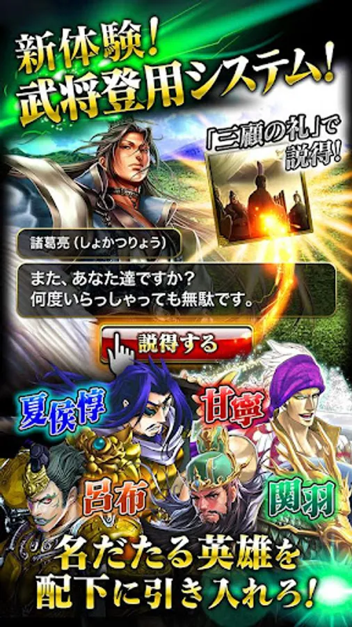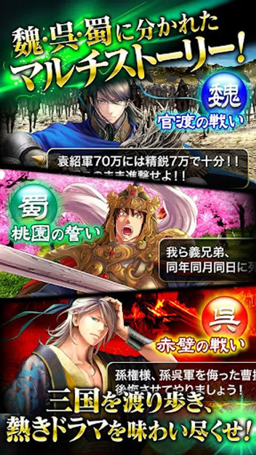 Let's run around the world of the Three Kingdoms based on historical facts with Cao Cao, Sun Quan, and Liu Bei, and grow up with the famous warlords you meet.