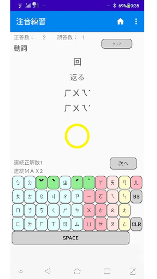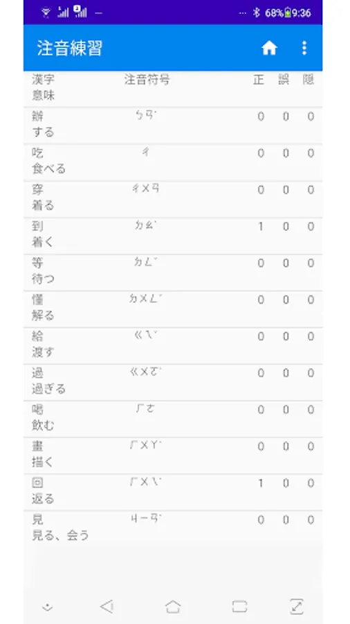 Bopomofo practice: This mode is to check if you remember the Bopomofo (pronunciation). Check if the Bopomofo corresponding to the displayed Chinese characters and meanings are entered from the bpmf keyboard in the app.