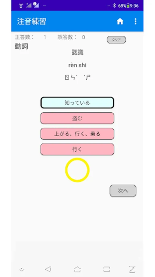 Word practice: This mode is for learning words (Kanji) and Bopomofo. A word (Chinese character), Bopomofo, and pinyin will be displayed. Select the meaning of the word from the four answers.