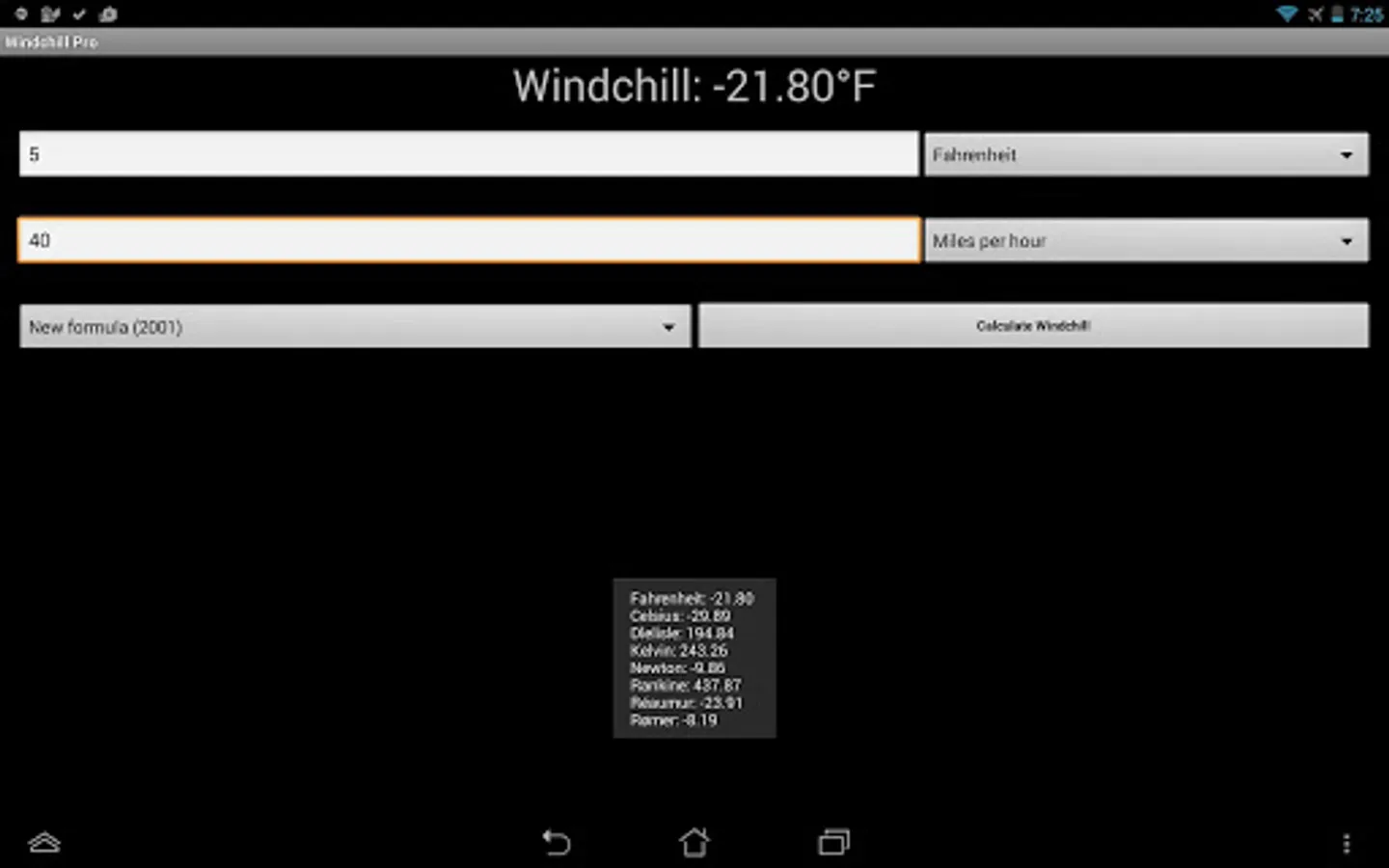 Are you a year round outdoor sports enthusiast? Catch yourself trying to figure out just how warmly to dress or realizing you didnt put on enough layers after its to late? Dont be caught blind anymore. In the winter windchill is a huge factor to figure into your outdoor activities, especially when you're on the move. With this app you can figure out what the windchill will be before you're in motion.