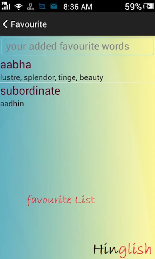 This fast and free app provides meanings and synonyms, with the largest collection of all local Hindi words used in daily life. It is a dictionary which has Hinglish to English and English to hinglish word searching feature in the offline mode.Hindi Dictionary, Hindi to english dictionary, english to hindi dictionary