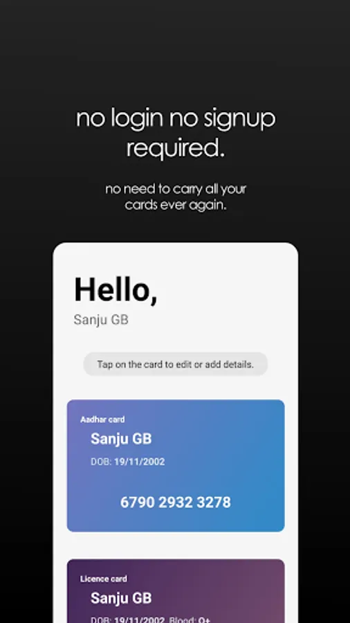 We developed e CARD with the goal of helping you carry your aadhaar card, licence card, credit card and debit card as a soft copy or as a digital copy instead of carrying them as a physical hard copy all the time.