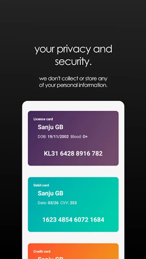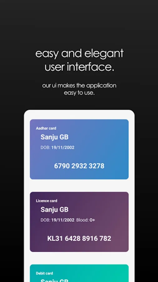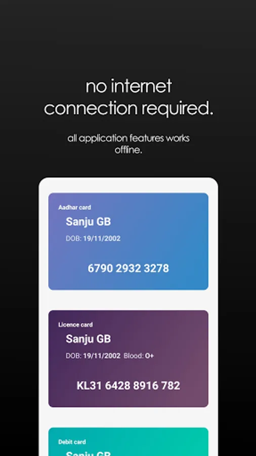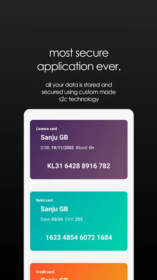 Most secure application ever: e CARD stores your aadhaar, licence, credit and debit card locally using our own custom made s2c technology.