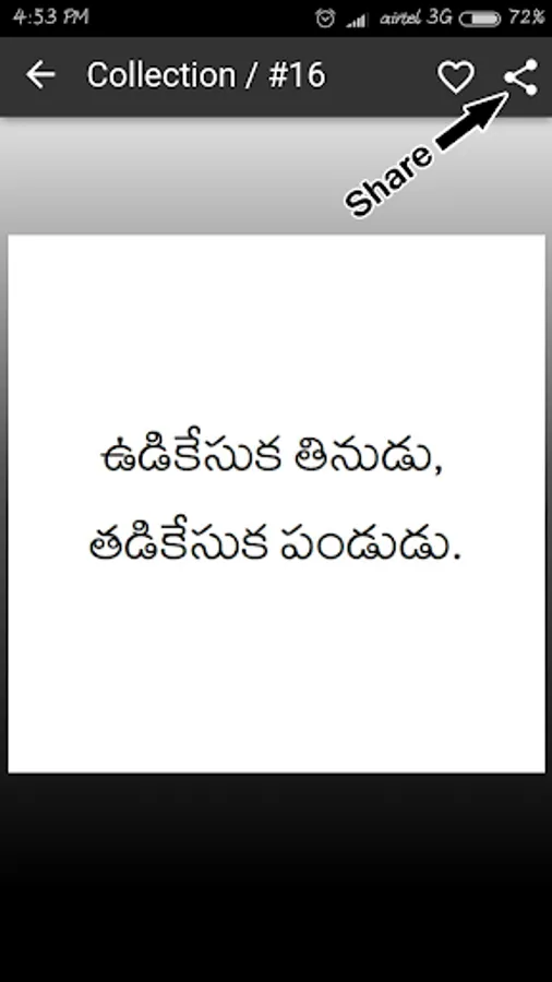 Proverbs / samethalu available in this app can be shared with friends and family using various social networking apps installed on your devices.