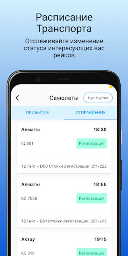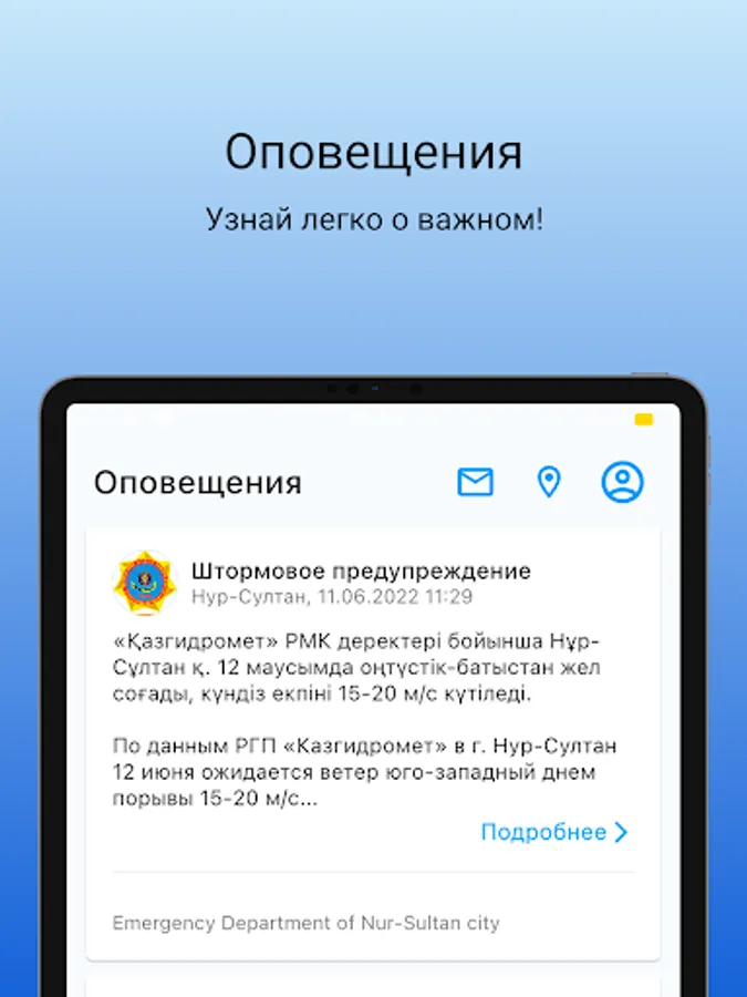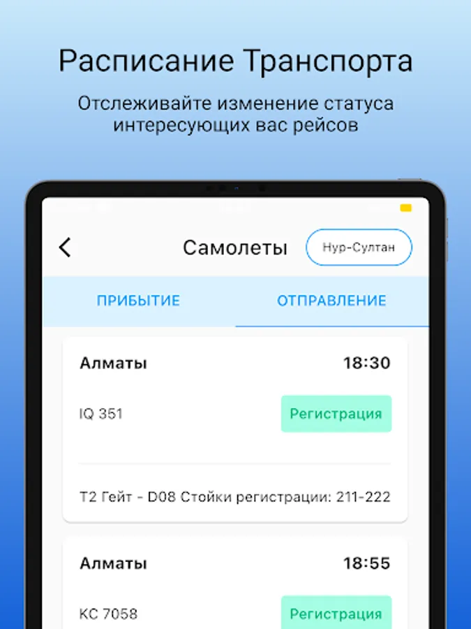 You will know the status of the flights and trains you are interested in. Get information about tax arrears in a timely manner. Learn about the status of the Tax Committee's systems when technical work is carried out on them. You will receive a notification about water outages (Temirtau) and electricity (Temirtau, Karaganda).