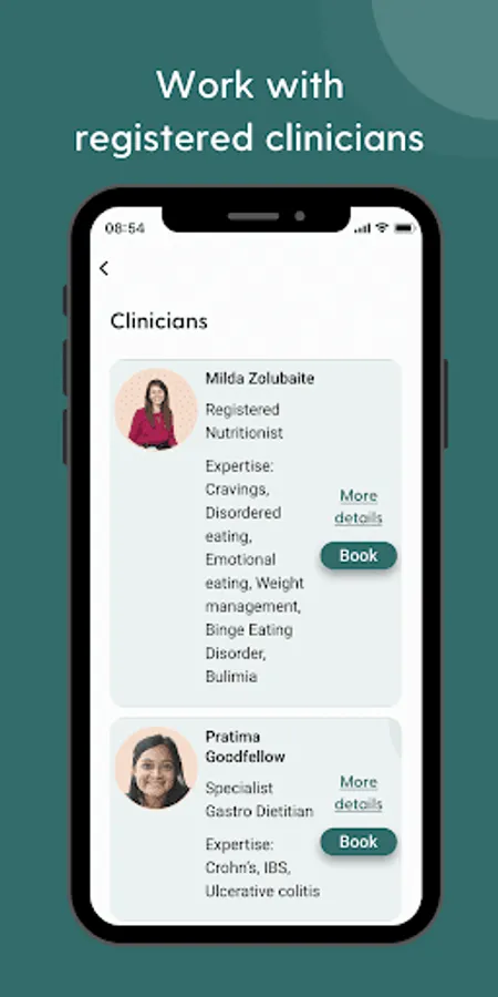 Clinicians: Find consultations based on your symptoms and work with dietitians and nutritionists through the app.