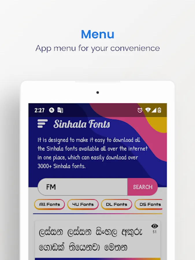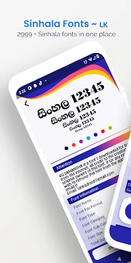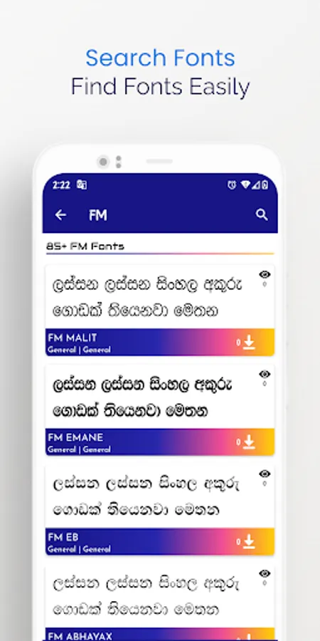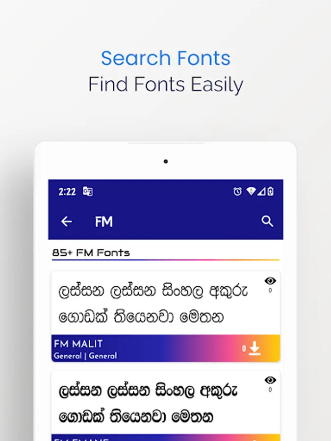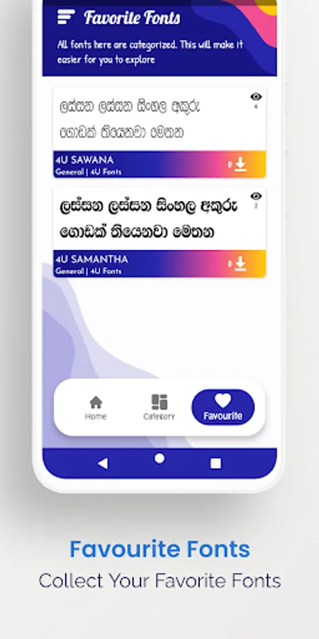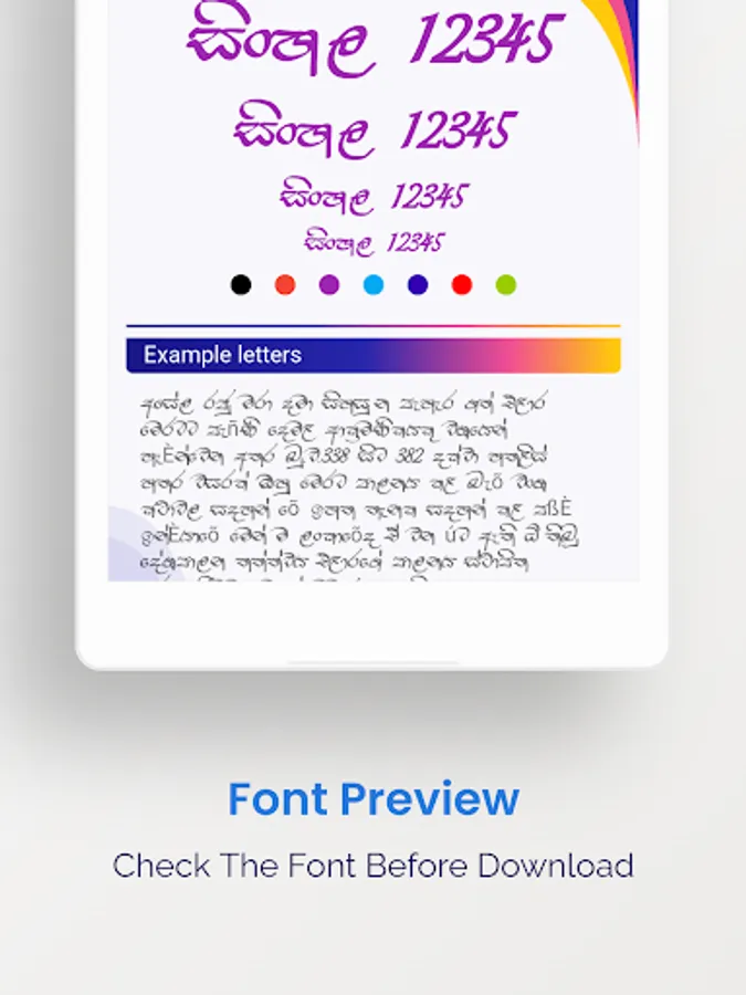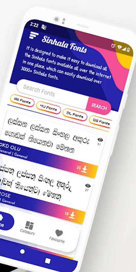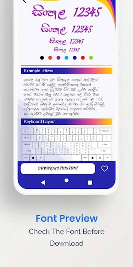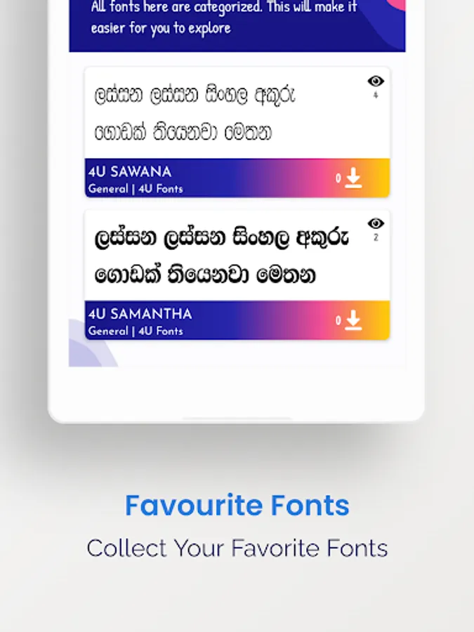 The app has been designed so that you can easily download a bunch of your favorite Sinhala fonts scattered all over the internet. To facilitate the selection of the font file you need, the app has been created so that you can see the appearance of the font file in the application. In addition, you can see all the details related to the font file from the download page. New Sinhala fonts are introduced to the software every day and you can use this font for any software program you use. All the fonts you download will be downloaded to your Android phone's Downloads folder.